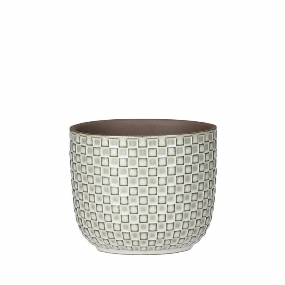 Plantenpot/bloempot van keramiek in de kleur wit met een mooi patroon. Diameter 11 cm en hoogte 9 cm. Stijlvolle bloempotten voor binnen gebruik met een glanzende finish. Serie: Daan. Het vierkantjes patroon aan de buitenzijde van de pot geeft het geheel een modieus fraai stijlvol uiterlijk. Handgemaakt keramiek.