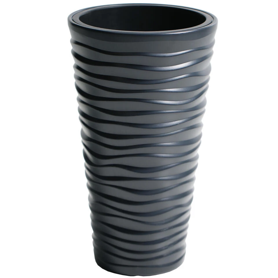 Bloempot/plantenpot met binnenpot. Hoge ronde bloempot met een golvend relief. Serie: Sand slim. Formaat: omtrek: ca 39 cm. Hoogte: ca 75 cm. Inhoud: 18 liter met binnenpot, 45 liter zonder binnenpot. Materiaal: kras en stootvast kunststof. Zonder afwateringsgaten. Geschikt voor binnen en buiten gebruik.