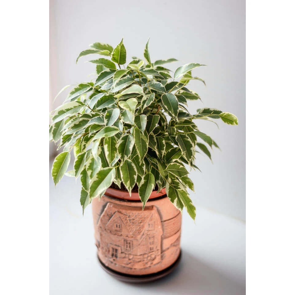 Misschien ken je Ficus benjamina wel als de treurvijg. Toch is deze kamerplant alles behalve treurig. Van nature komt de Ficus benjamina uit de tropische delen van Zuidoost Azië en Australië. De naam treurvijg is te herleiden uit de jonge twijgen en bladeren die gaan hangen. Maar dat kun je hem ook niet kwalijk nemen, met al die tropische temperaturen. In de huiskamer groeit deze Ficus niet zo onstuimig. Het is een sterke kamerplant die het qua groeien lekker rustig aan doet. Dit betekent dat je er lang plezier van kunt hebben. De ‘Kinky’ variant blijft klein en compact en kan je dus in ieder huis gemakkelijk kwijt. De Ficus benjamina ‘Kinky’ heeft een mediterraans uiterlijk. De lichtgroene bladeren hebben een vlekkige, goudkleurige rand.